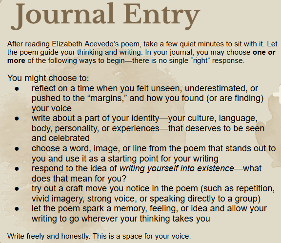 One of the shared videos shared in class included this video from 2018 of Acevedo sharing “This is For Us” after The Poet X, her debut novel, was published. I also gave the students a copy of the poem and asked them to analyze the craft moves made by the author. Finally I asked the students to select one of the following invitations to write in their journal notebooks in response to the poem.